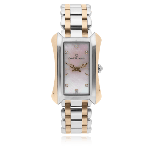 Carl F. Bucherer Alacria mit einem 27 mm Bicolor Gehäuse und Saphir-Glas, Wasserdicht; im Innern befindet sich das Quartz Kaliber 280-002, das Zifferblatt ist Perlmutt Index / Diamants ohne Datums-Anzeige, das Band ist ein Bicolor Metallband; Zubehör: Verkaufs-Box (original), Verkaufs-Garantie (original).