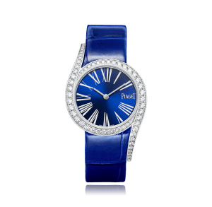PIAGET Armbanduhr, Limelight Gala 32mm, 18K Weissgold, Alligator-Band, mit Dorn-Schliesse Zifferblatt: blau römisch, Quarz Kaliber 690P, Saphir-Glas 3 Atm, 63 Diamanten total: 1.76 ct. Ref.:GOA42163
