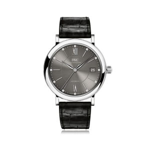 Wristwatch IWC Portofino, 37mm, steel, alligator leather strap, with pin buckle, slate dial with roman / diamonds, automatic Cal. A/35111, sapphire-crystal, water-resistant, 12 diamonds, total: 0.07 ct. Ref.:IW458102