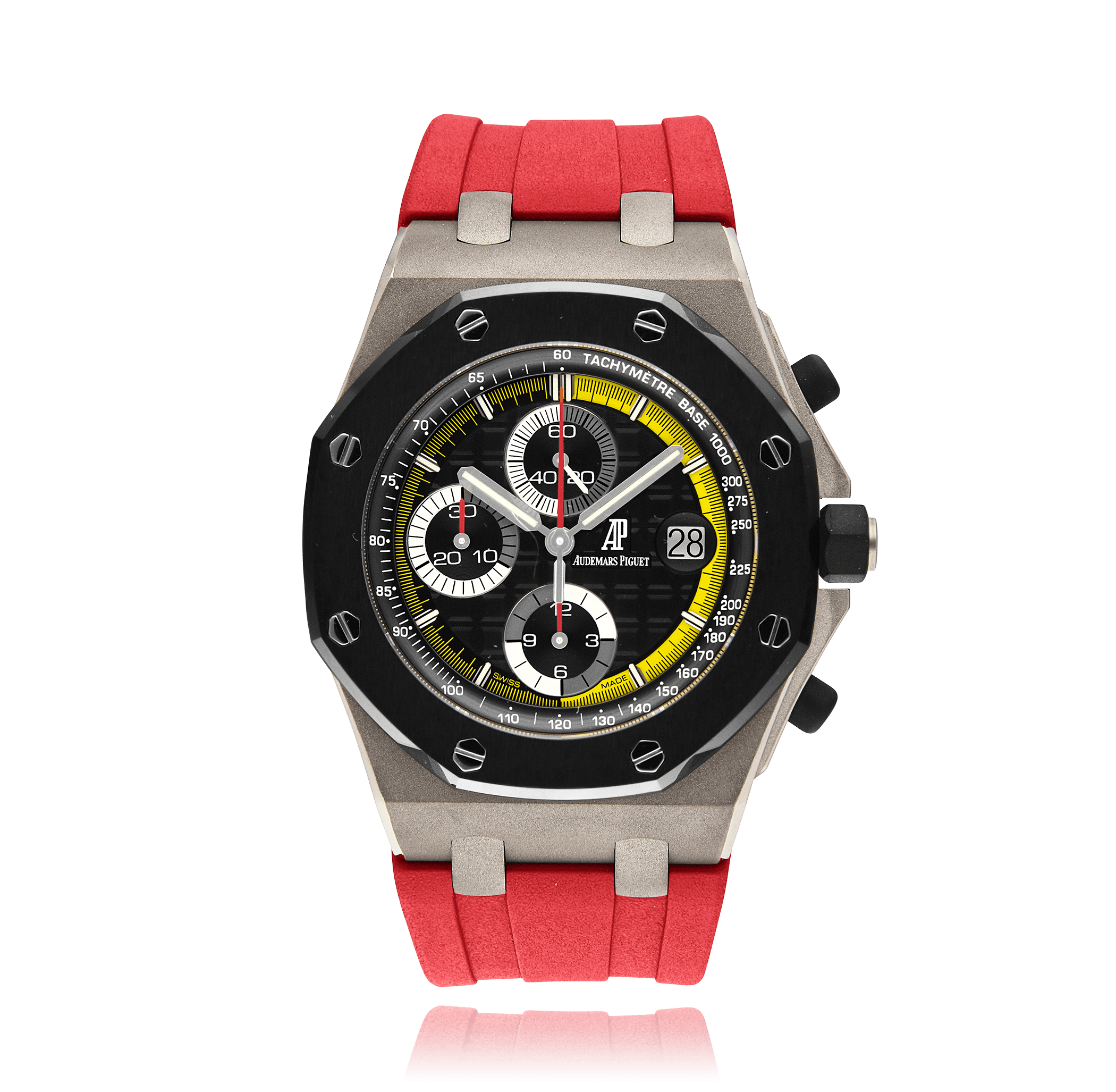Audemars Piguet Royal Oak Offshore with a 42 mm titanium case and a sapphire glass, water resistant; inside is the automatic calibre 3126/3840, a black index face with date indication, the bracelet is a rubber ; accessory: sales guarantee (original), sales box (original).