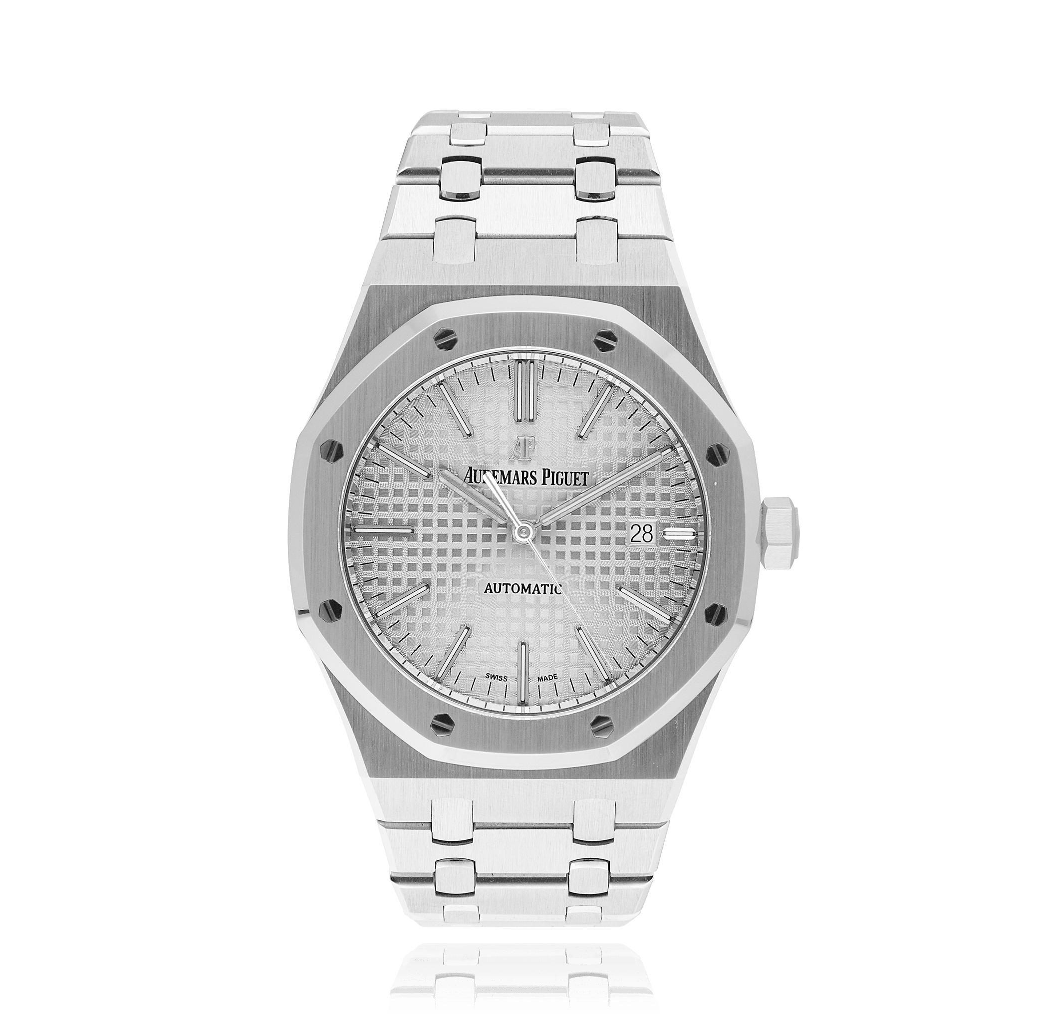 Audemars Piguet Royal Oak with a 41 mm stainless steel case and a sapphire glass, water resistant; inside is the automatic calibre 3120, a silver index face with date indication, the bracelet is a steel metal bracelet; accessory: sales guarantee (original), sales box (original).
