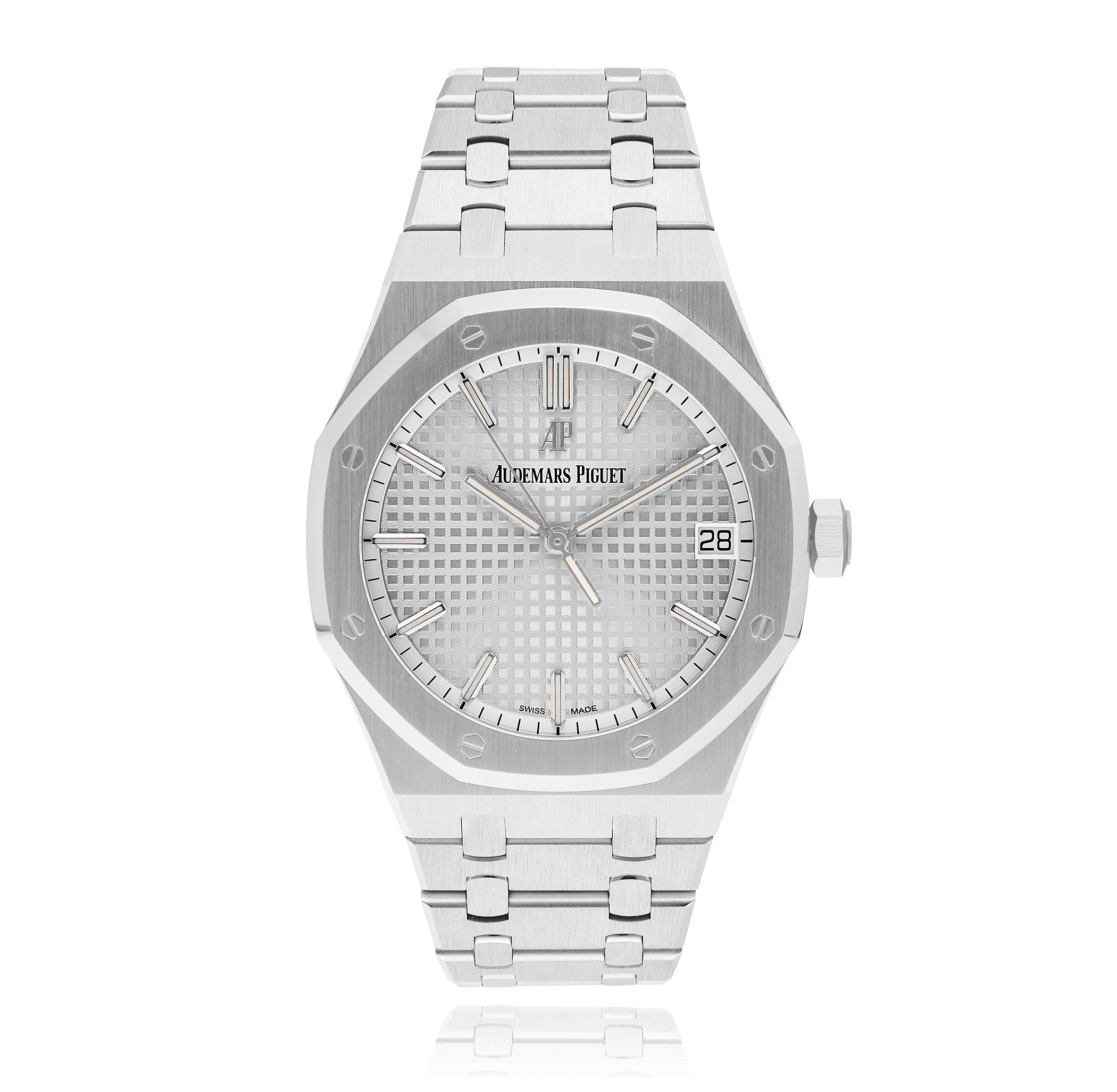 Audemars Piguet Royal Oak with a 41 mm stainless steel case and a sapphire glass, water resistant; inside is the automatic calibre 4302, a silver index face with date indication, the bracelet is a steel metal bracelet; accessory: sales guarantee (original), sales box (original).