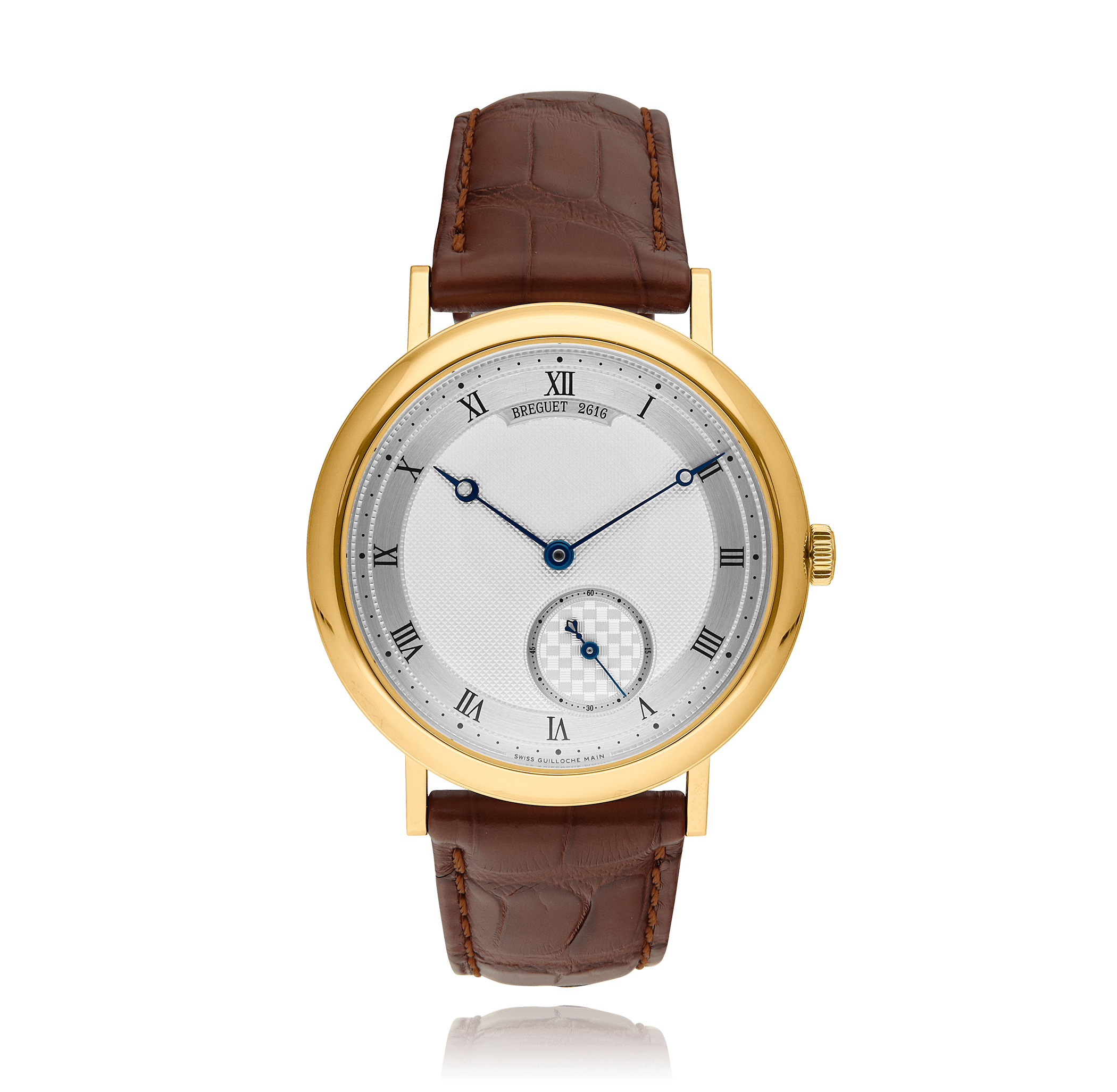 Breguet Classique with a 41 mm yellow gold case and a sapphire glass, water resistant; inside is the automatic calibre , a silver roman face without date indication, the bracelet is a alligator leather; accessory: sales box (original), sales guarantee (original).