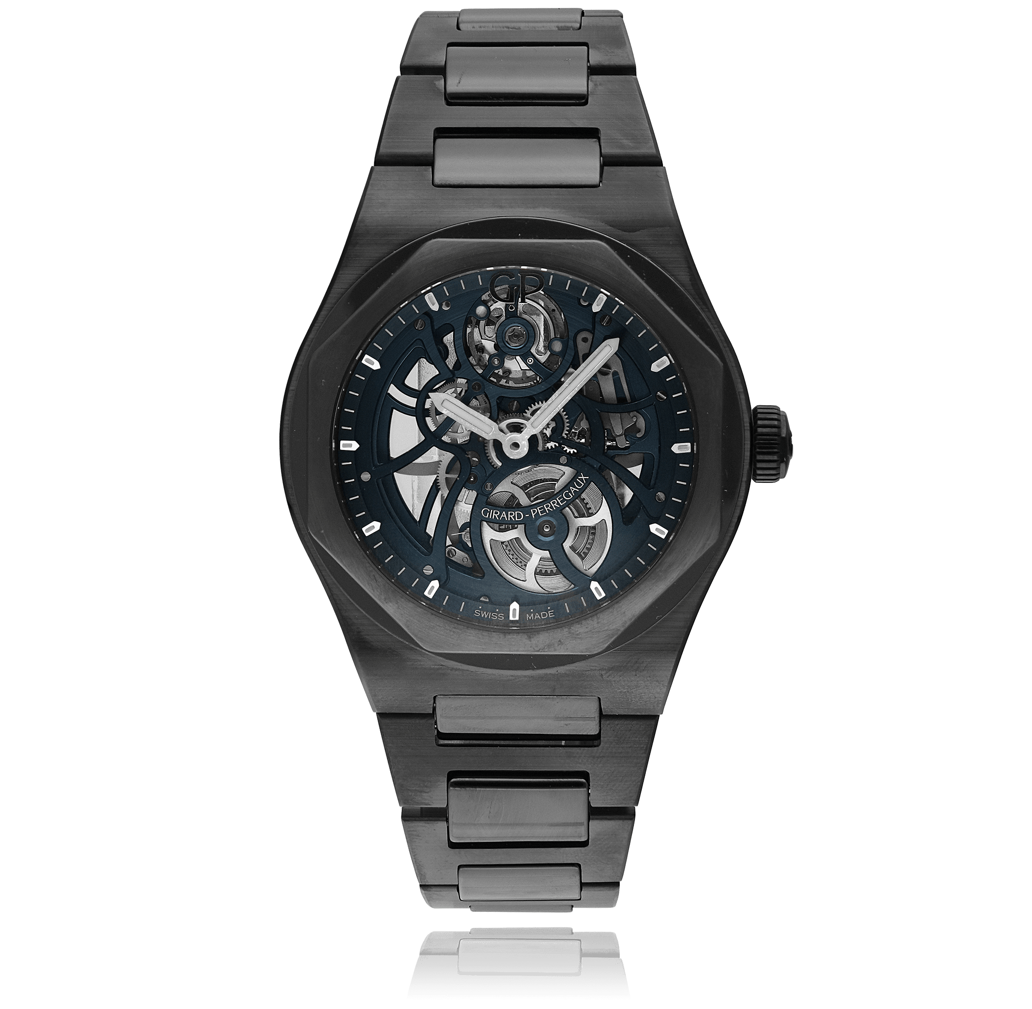Girard-Perregaux Laureato with a 42 mm ceramic case and a sapphire glass, water resistant; inside is the automatic calibre gp01800, a blue index face without date indication, the bracelet is a ; accessory: sales guarantee (original), sales box (original).