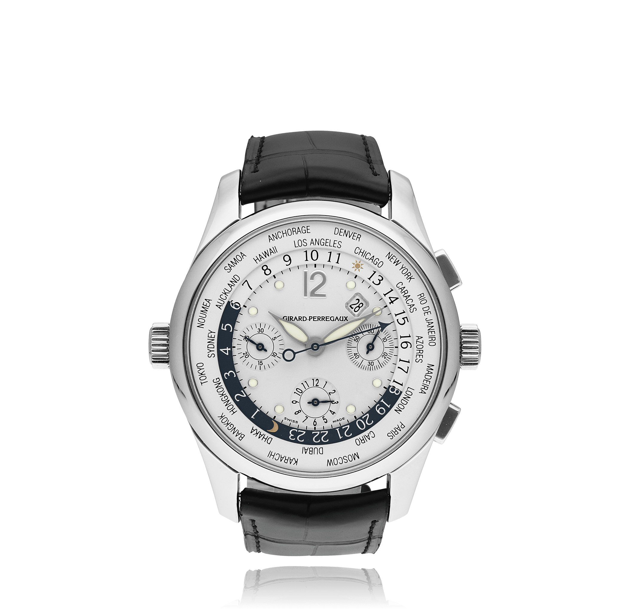 Girard-Perregaux WW.TC with a 43 mm white gold case and a sapphire glass, water resistant; inside is the automatic calibre , chronographsecond time zonemultiple time zones as additional function a white arabic / index face with date indication, the bracelet is a alligator leather; accessory: sales guarantee (original), sales box (original).