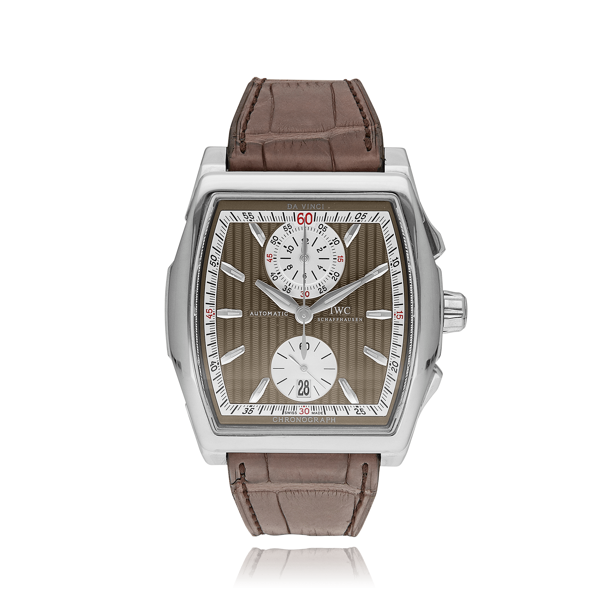 IWC Schaffhausen Da Vinci with a 42 mm white gold case and a sapphire glass, water resistant; inside is the automatic calibre 89360, chronograph as additional function a grey index face with date indication, the bracelet is a alligator leather; accessory: bucherer box.