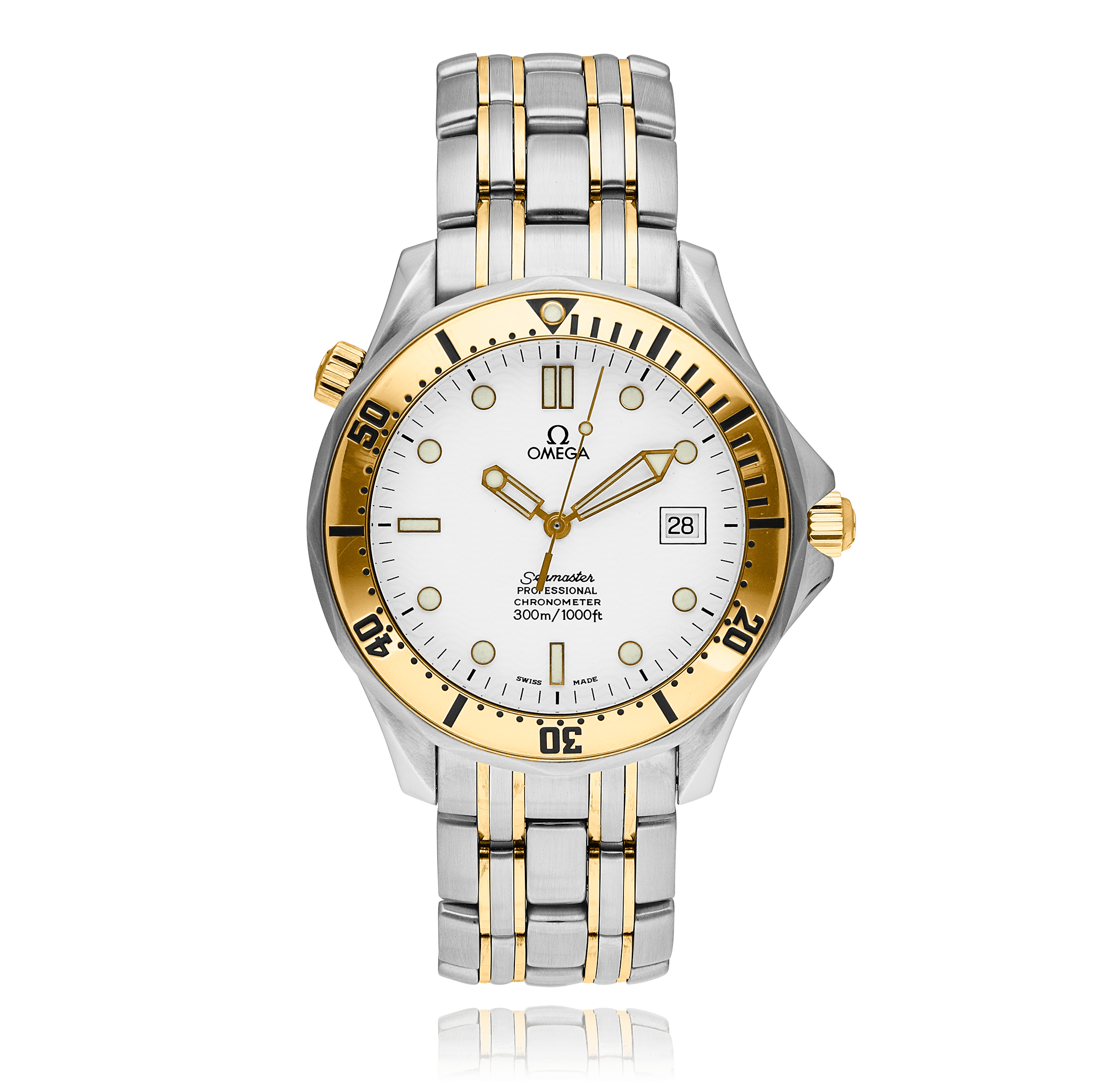 Omega Seamaster with a 41 mm bicolour case and a sapphire glass, water resistant; inside is the automatic calibre 1109, a white index face indication, the bracelet is a bicolour metal bracelet; accessory: sales box (original).
