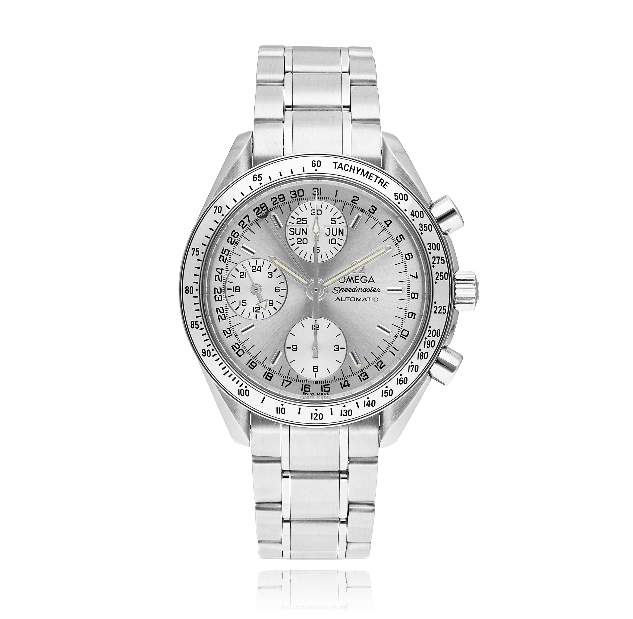 Omega Speedmaster with a 39 mm stainless steel case and a sapphire glass, water resistant; inside is the automatic calibre 1151, chronograph as additional function a silver index face date/day/month indication, the bracelet is a steel metal bracelet; accessory: sales guarantee (original), bucherer box.