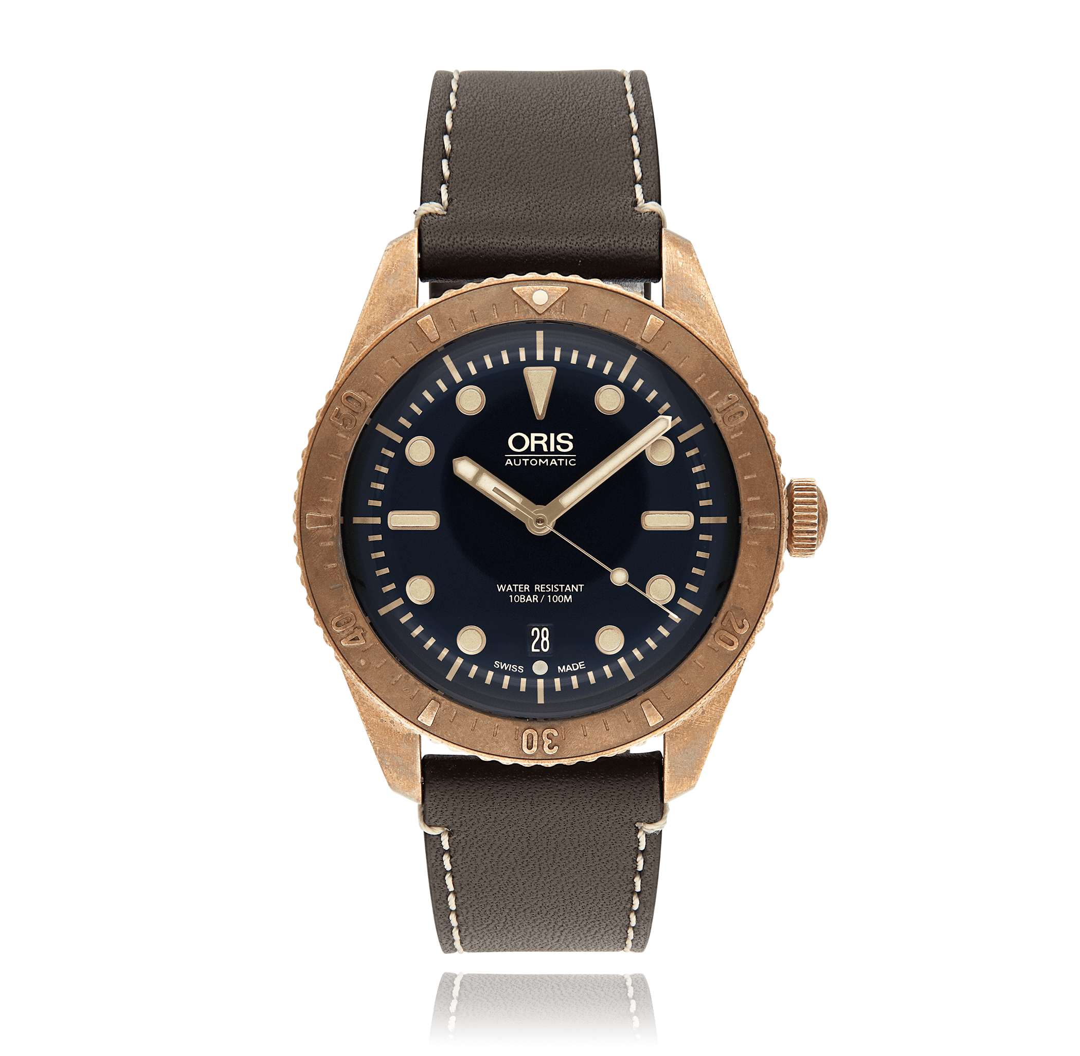 Oris Divers with a 42 mm bronze case and a sapphire glass, water resistant; inside is the automatic calibre , a blue index face with date indication, the bracelet is a bovine leather; accessory: sales guarantee (original), bucherer box.