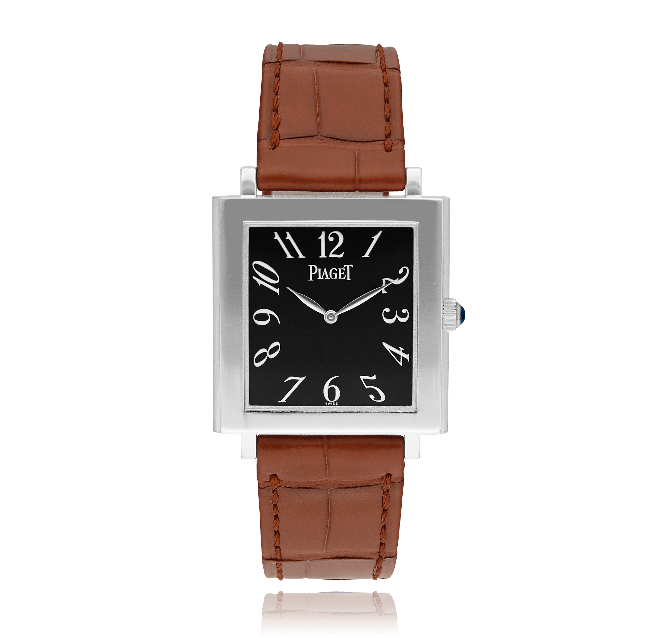 Piaget Altiplano with a 29 mm white gold case and a sapphire glass, water resistant; inside is the manual calibre , a black arabic face without date indication, the bracelet is a alligator leather; accessory: sales box (original).