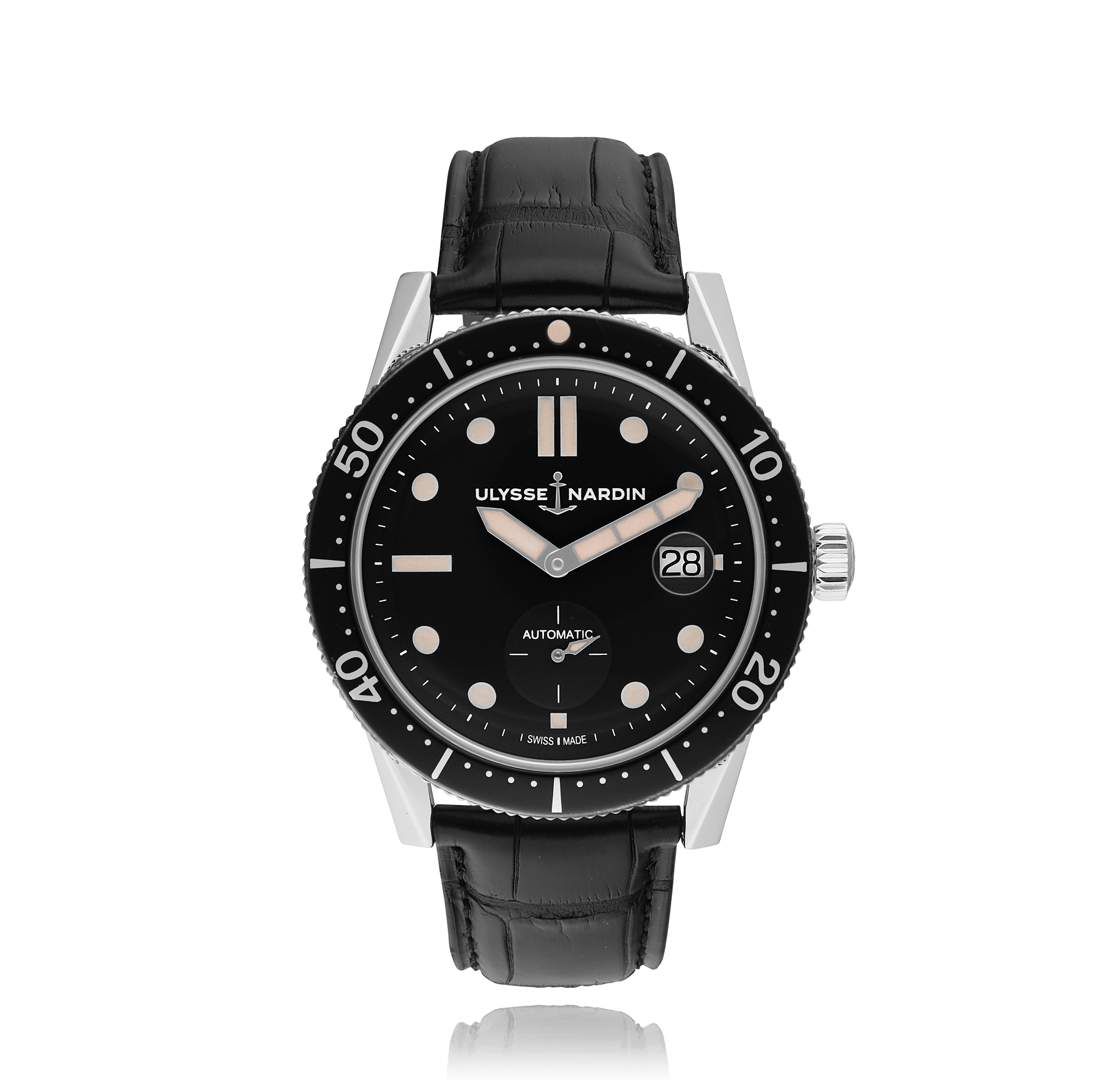 Ulysse Nardin Diver with a 42 mm stainless steel case and a sapphire glass, water resistant; inside is the automatic calibre , a black index face with date indication, the bracelet is a alligator leather; accessory: sales guarantee (original), bucherer box.