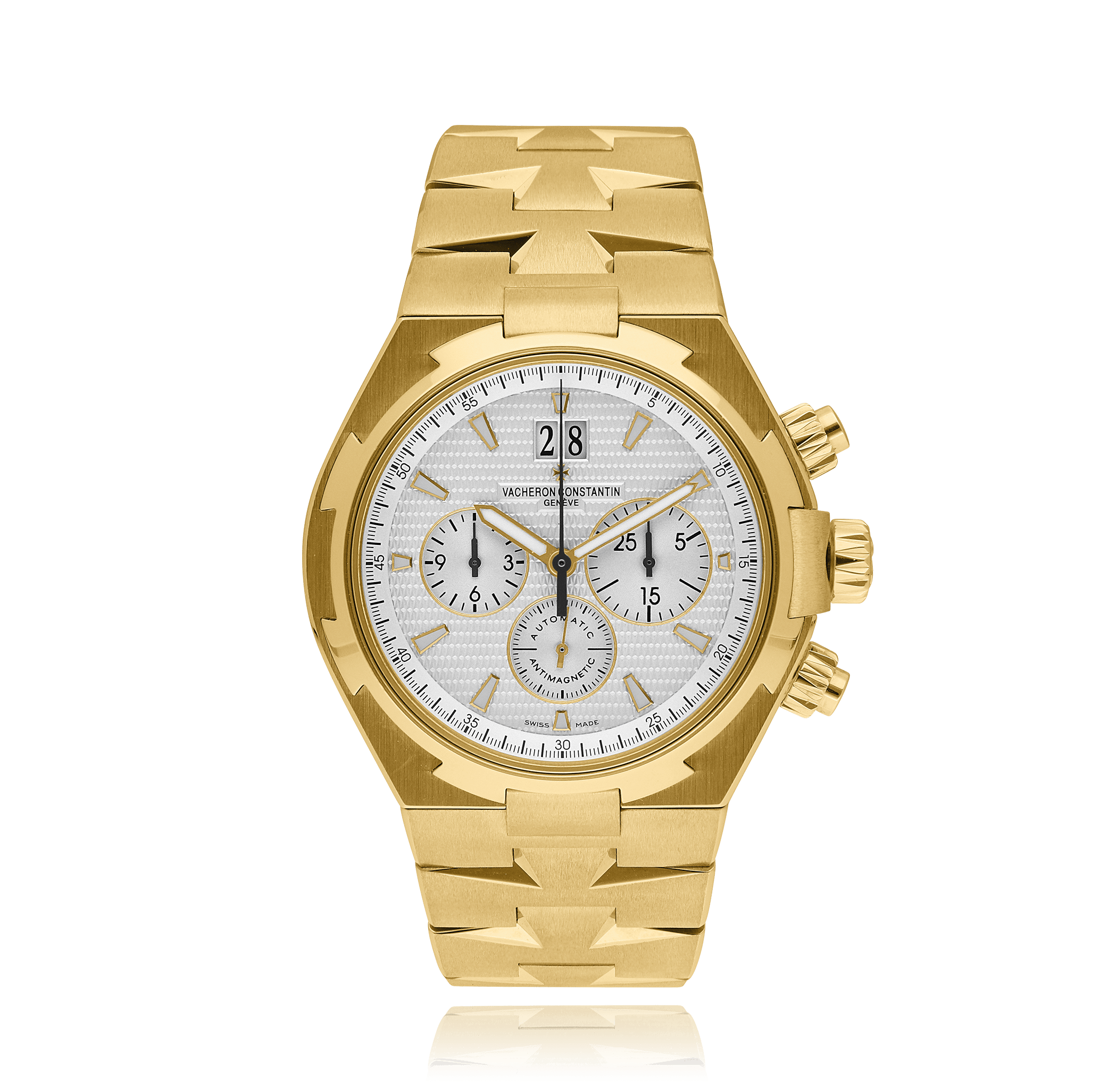 Vacheron Constantin Overseas with a 42.5 mm yellow gold case and a sapphire glass, water resistant; inside is the automatic calibre , chronograph as additional function a white index face with date indication, the bracelet is a gold metal bracelet; accessory: sales guarantee (original), sales box (original).