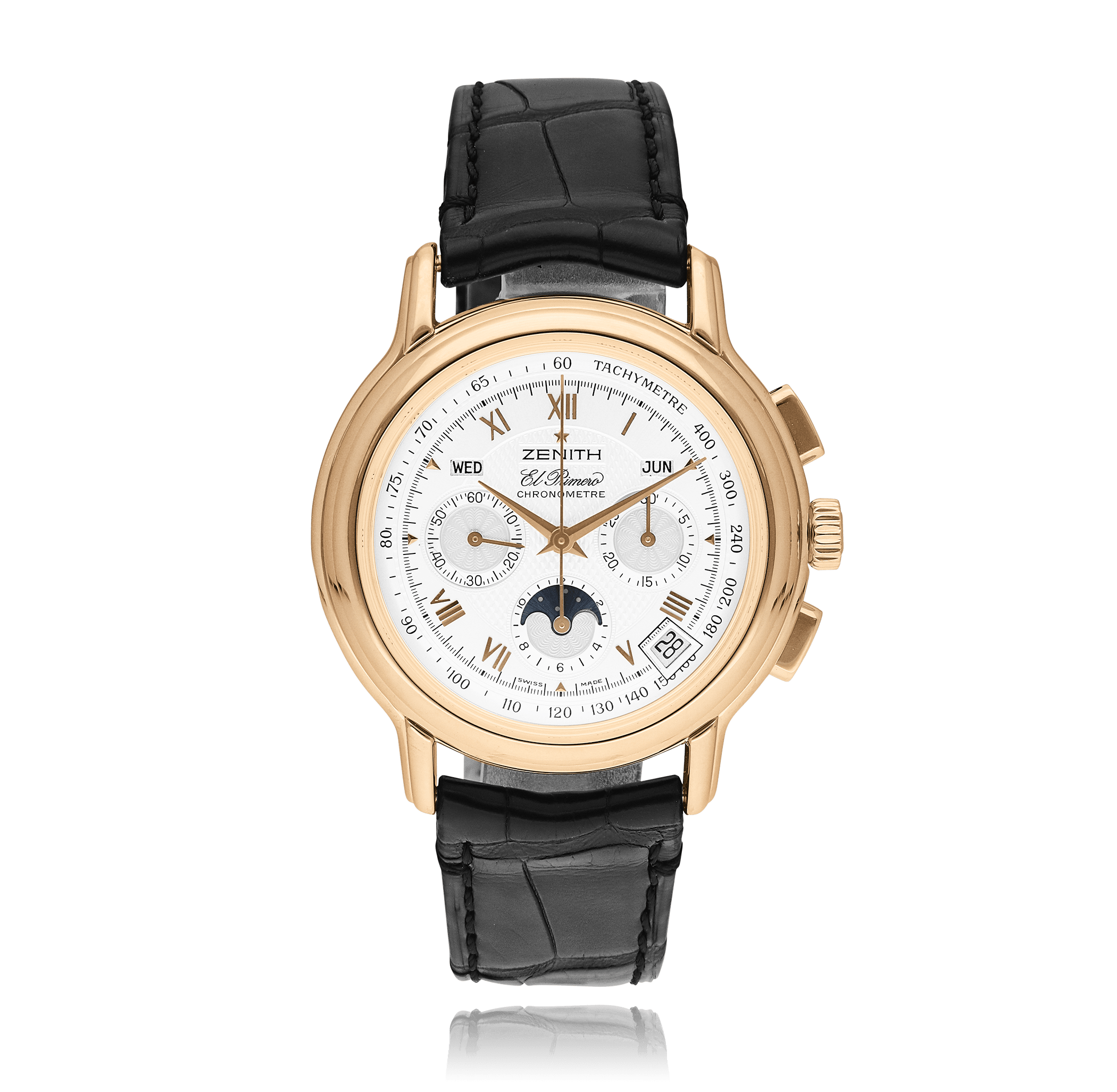 Zenith Chronomaster with a 40 mm rose gold case and a sapphire glass, water resistant; inside is the automatic calibre 410, chronograph as additional function a silver roman / index face with date indication, the bracelet is a alligator leather; accessory: sales guarantee (original), sales box (original).