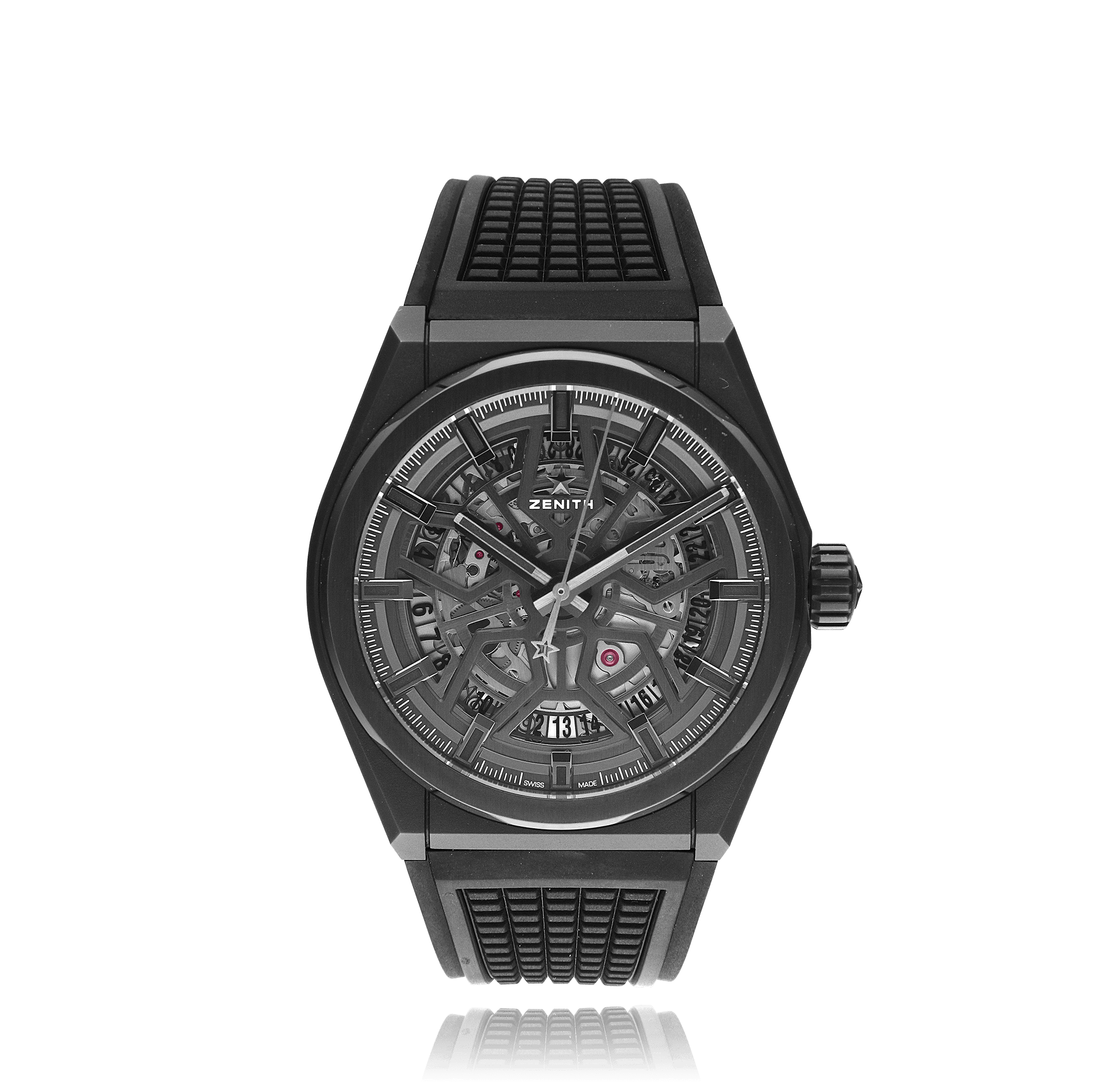 Zenith Defy with a 41 mm ceramic case and a sapphire glass, water resistant; inside is the automatic calibre 670, a skeleton index face with date indication, the bracelet is a rubber; accessory: sales guarantee (original), sales box (original).