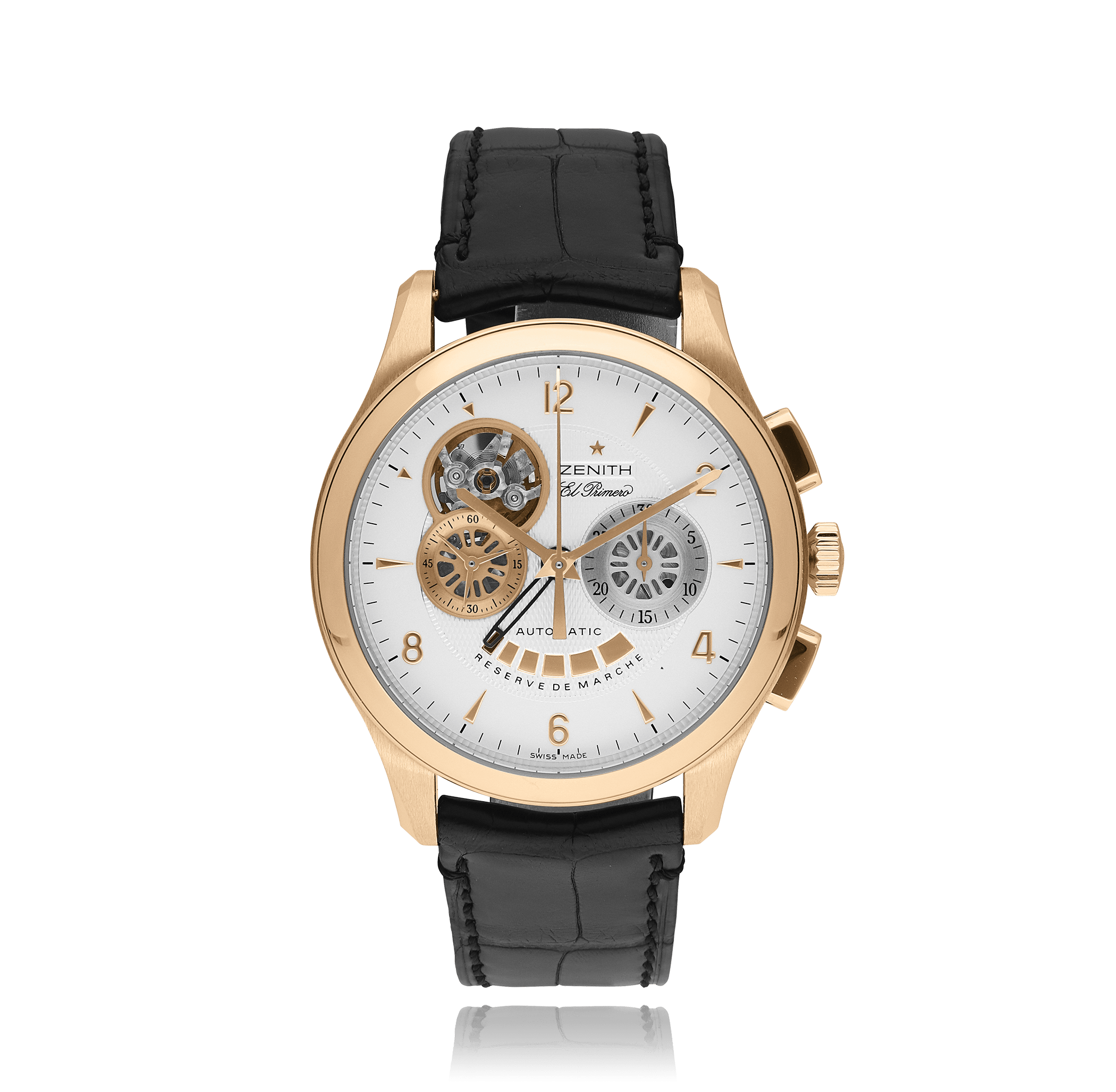 Zenith El Primero with a 40 mm rose gold case and a sapphire glass, water resistant; inside is the automatic calibre , a white arabic / index face without date indication, the bracelet is a alligator leather; accessory: sales box (original).