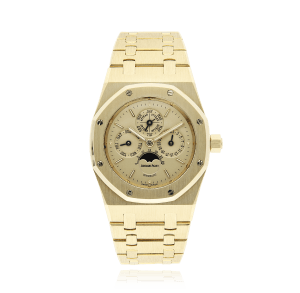 Audemars Piguet Royal Oak mit einem 34 mm Gelbgold Gehäuse und Saphir-Glas, Wasserdicht; im Innern befindet sich das Automat Kaliber , mit Zusatzfunktion Ewiger Kalender das Zifferblatt ist Champagne Index Datum/Tag/Monats-Anzeige, das Band ist ein Gold Metallband; Zubehör: Verkaufs-Box (original).