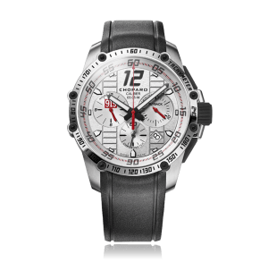 Chopard Classic Racing mit einem 45 mm Edelstahl Gehäuse und Saphir-Glas, Wasserdicht; im Innern befindet sich das Automat Kaliber , das Zifferblatt ist Silber Arabisch / Index mit Datums-Anzeige, das Band ist ein Kautschuk ; Zubehör: Verkaufs-Garantie (original), Verkaufs-Box (original).