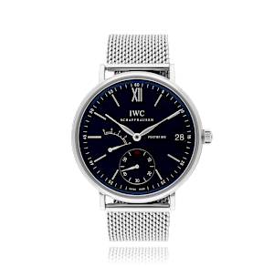 IWC Schaffhausen Portofino mit einem 45 mm Stahl Gehäuse und Saphir-Glas, Wasserdicht; im Innern befindet sich das Handaufzug Kaliber 59210, das Zifferblatt ist Schwarz Index mit Datums-Anzeige, das Band ist ein Stahl Metallband; Zubehör: Bucherer-Box.