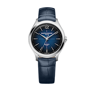 BAUME & MERCIER Armbanduhr, Clifton 34 mm, Stahl, Alligatorlederband, marine, mit Dorn-Schliesse Zifferblatt: blau arab./Index, Automat, Kaliber Baumatic BM13-1975A, Saphir-Glas, 5 Atm,. Ref.:M0A10833
