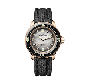 BLANCPAIN Armbanduhr, Fifty Fathoms 38.2 mm, Rotgold, Kautschukband, schwarz, mit Falt-Schliesse Zifferblatt: Perlmutt Index, Automat, Kaliber 1315, Zentrum-Sekunde, satiniert, Saphir-Glas, 30 Atm, Ref.:5007-3644A-B52B
