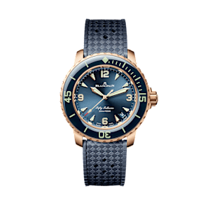 BLANCPAIN Armbanduhr, Fifty Fathoms 38.2 mm, 18K Rotgold, Kautschukband, blau, mit Dorn-Schliesse Zifferblatt: blau Index, Automat, Kaliber 1315, Zentrum-Sekunde, satiniert, Saphir-Glas, 30 Atm,. Ref.:5007-36B40-O64A