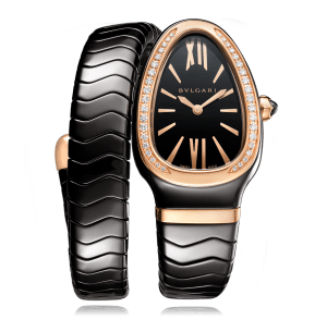 BVLGARI Armbanduhr, Serpenti Spiga, 35 mm, Keramik, Keramik-Band, Zifferblatt: schwarz röm./Index, Quarz, Saphir-Glas, 3 Atm, Diamanten 18 Karat Roségold mit Diamanten Ref.:102532