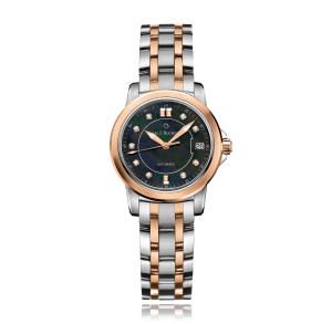 CARL F. BUCHERER Patravi AutoDate 27 mm Armbanduhr, 18 K Stahl/Rotgold Automat mit Datum rund 10 Atm/verschraubte Krone Zifferblatt: Perlmutt schwarz Index / Diamanten, Stahl/Rotgold- Band, Ref.:00.10621.07.87.21