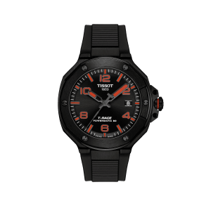 TISSOT Armbanduhr, T-Race POWERMATIC 80, 41 mm, Stahl DLC schwarz, Silikon Band, schwarz, mit Falt-Schliesse Zifferblatt: schwarz arab./Index, Automat, Kaliber Powermatic 80, Zentrum-Sekunde, Saphir-Glas, 10 Atm, Ref.:T141.807.37.057.00