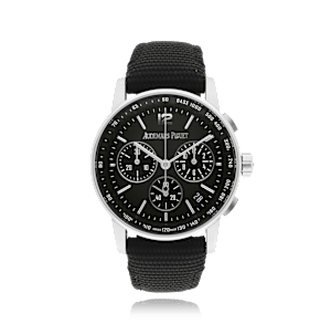 Audemars Piguet CODE 11.59 with a 42 mm white gold case and a sapphire glass, water resistant; inside is the automatic calibre , a black arabic / index face with date indication, the bracelet is a fabric ; accessory: sales guarantee (original), sales box (original).
