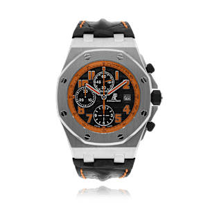 Audemars Piguet Royal Oak Offshore with a 43 mm stainless steel case and a sapphire glass, water resistant; inside is the automatic calibre , a black arabic face with date indication, the bracelet is a alligator leather; accessory: sales guarantee (original), sales box (original).