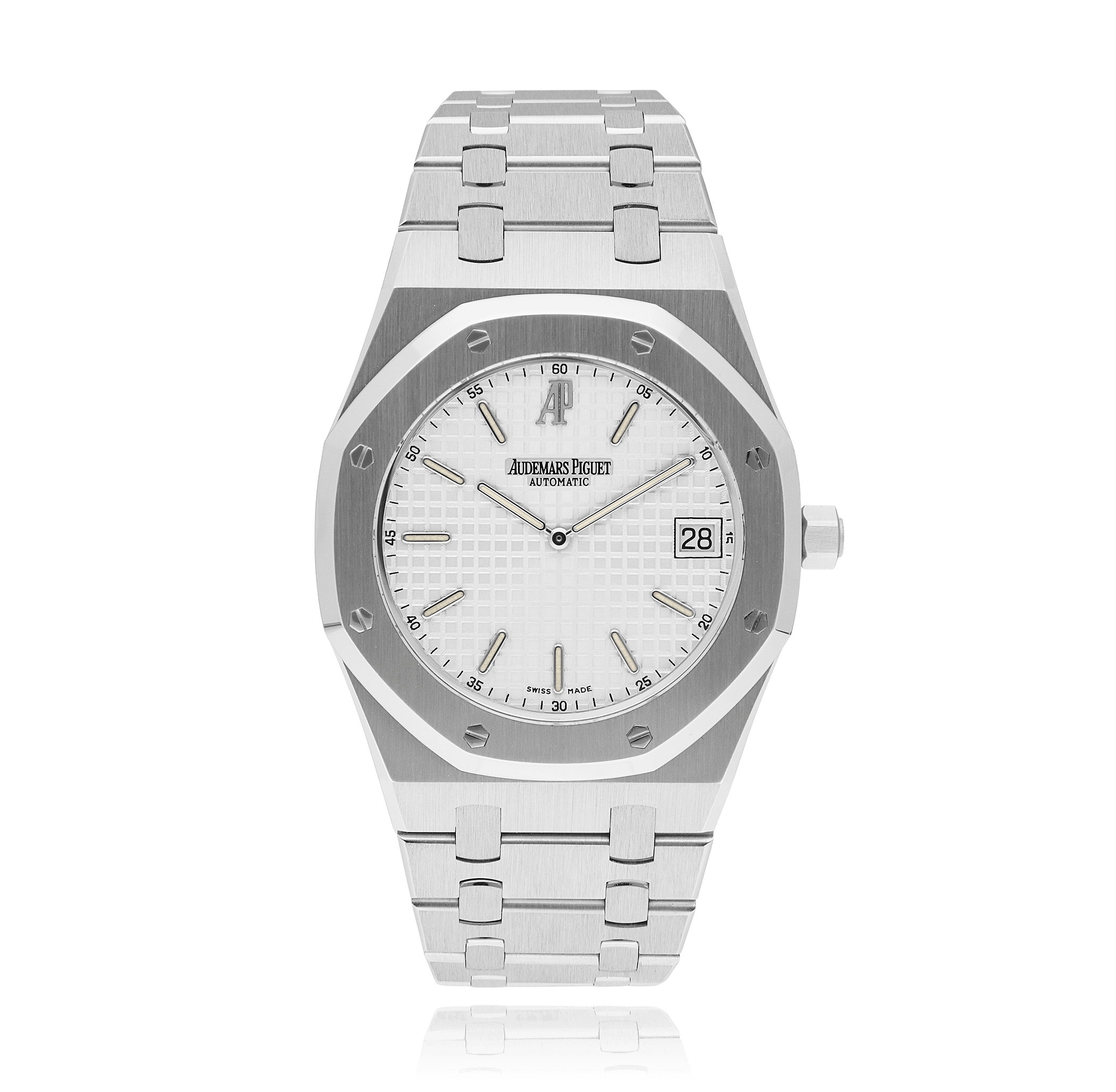 Audemars Piguet Royal Oak with a 39 mm stainless steel case and a sapphire glass, water resistant; inside is the automatic calibre 2121, a white index face with date indication, the bracelet is a steel metal bracelet; accessory: sales box (original).