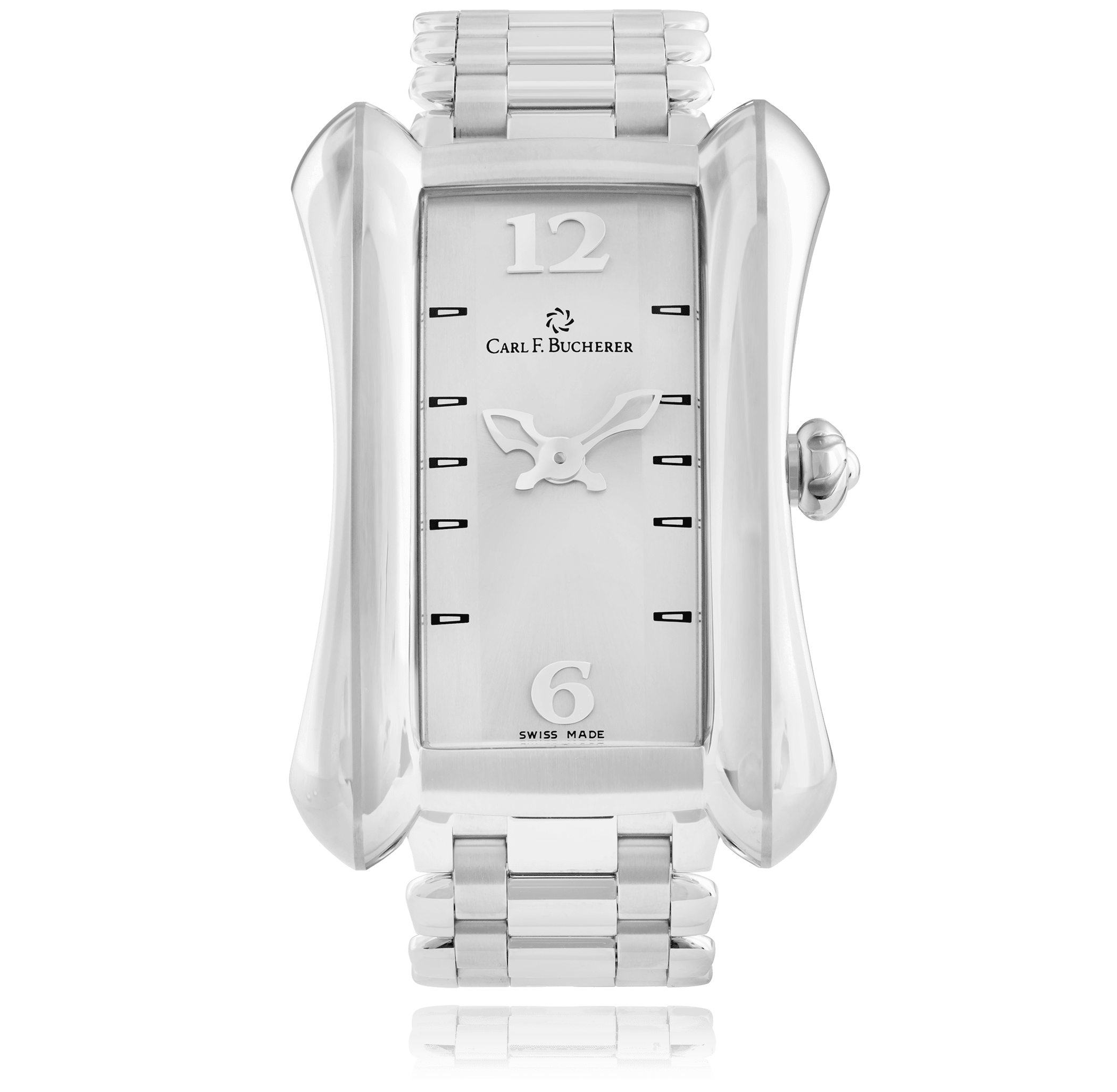 Carl F. Bucherer Alacria with a 45 mm stainless steel case and a sapphire glass, water resistant; inside is the quartz calibre , a silver arabic / index face indication, the bracelet is a steel metal bracelet; accessory: sales box (original), sales guarantee (original).