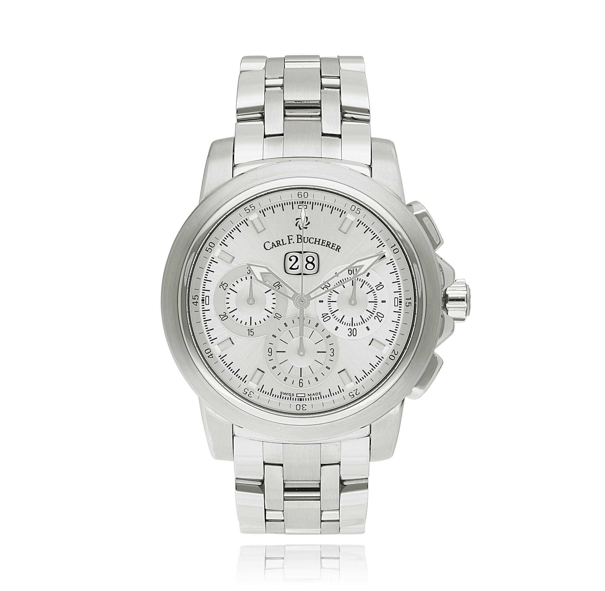 Carl F. Bucherer Patravi, with a 45 mm stainless steel case and a sapphire glass, water resistant; inside is the automatic calibre 4500/2892-a2, chronograph as additional function a silver index face with date indication, the bracelet is a steel metal bracelet; accessory: bucherer box