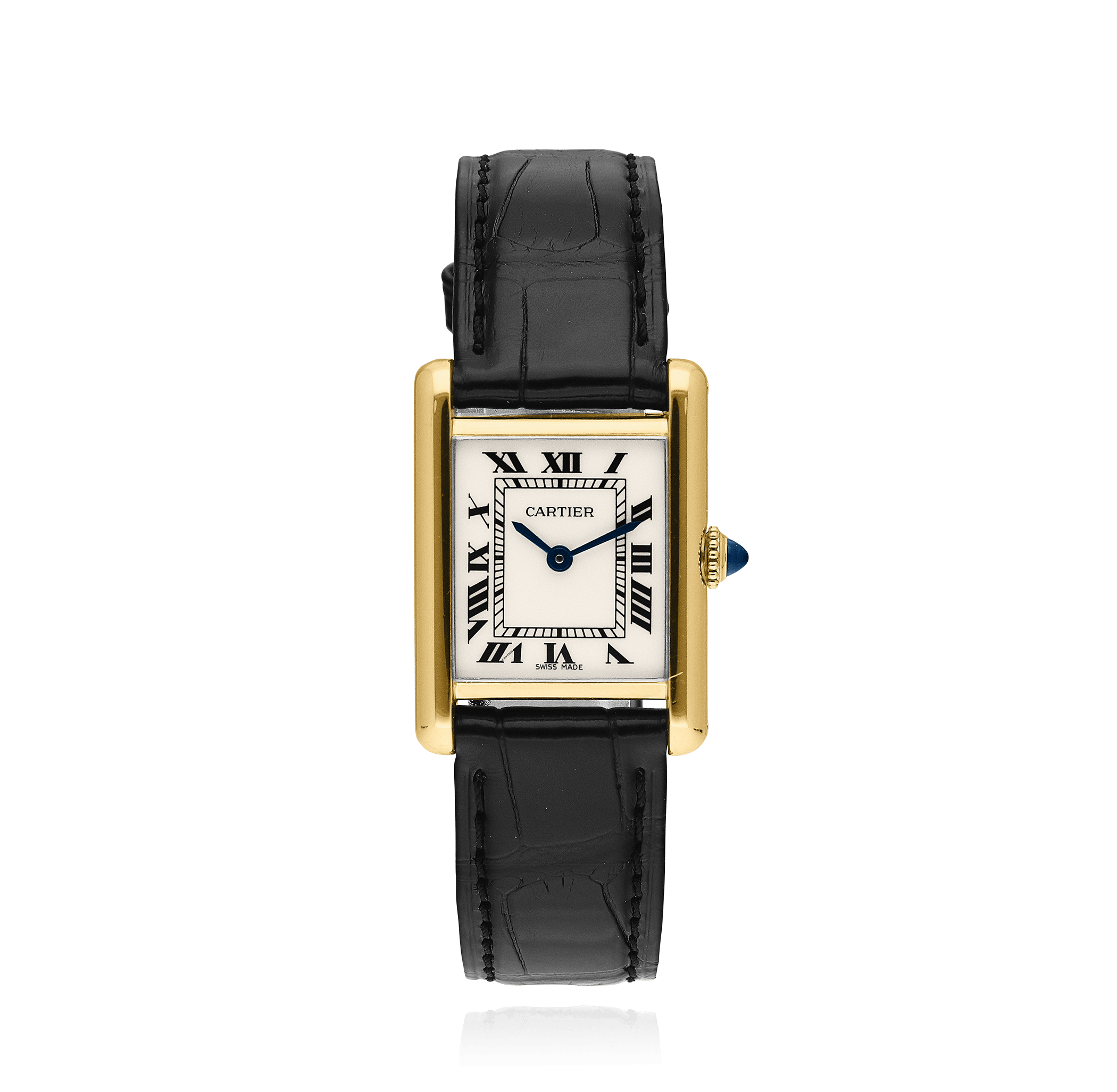 Cartier Tank with a 21 mm yellow gold case and a sapphire glass, water resistant; inside is the manual calibre , a white roman face without date indication, the bracelet is a alligator leather; accessory: bucherer box.