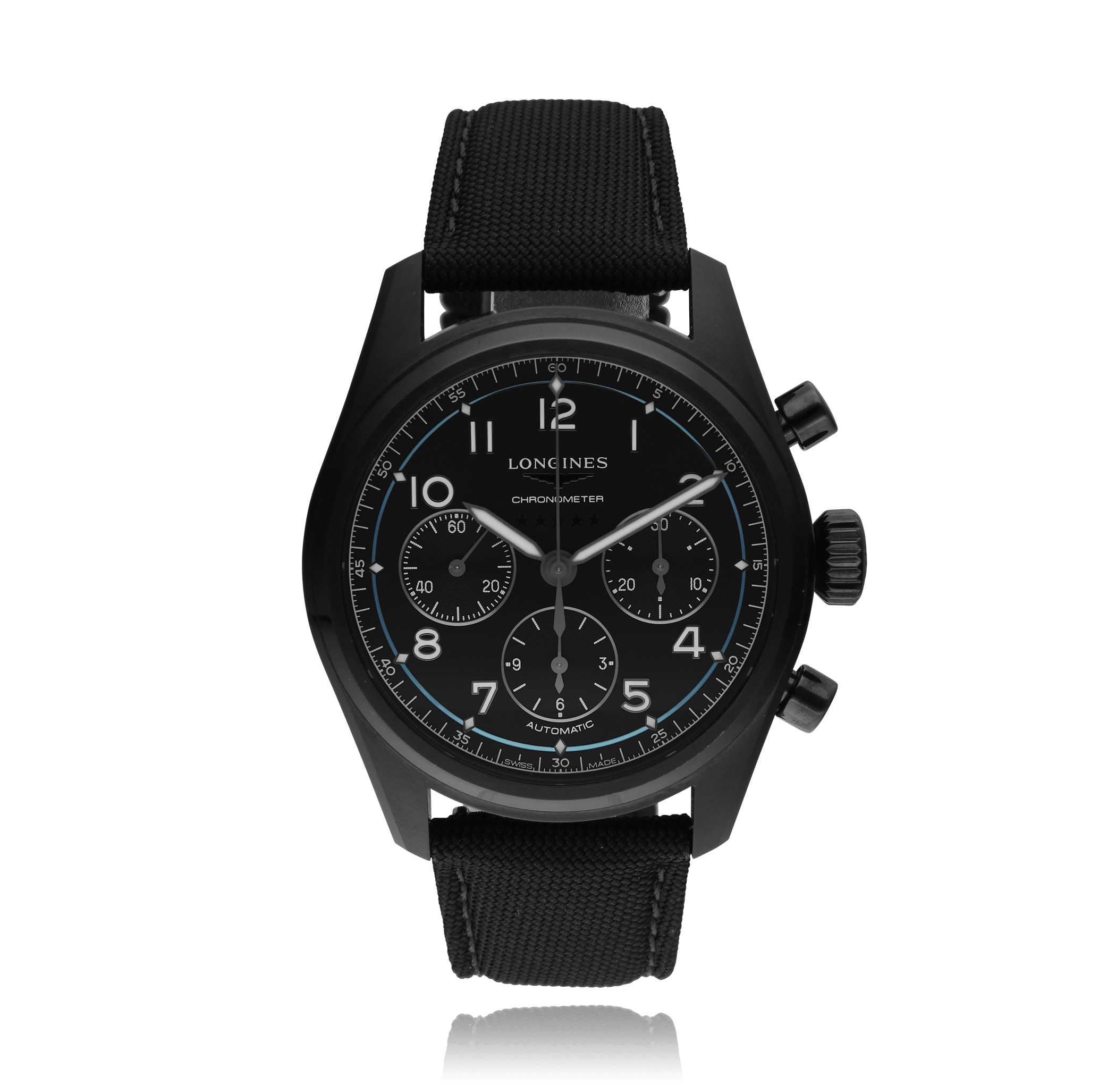 Longines Spirit with a 42 mm stainless steel case and a sapphire glass, water resistant; inside is the automatic calibre 688, chronograph as additional function a black arabic / index face with date indication, the bracelet is a fabric ; accessory: sales guarantee (original), sales box (original).