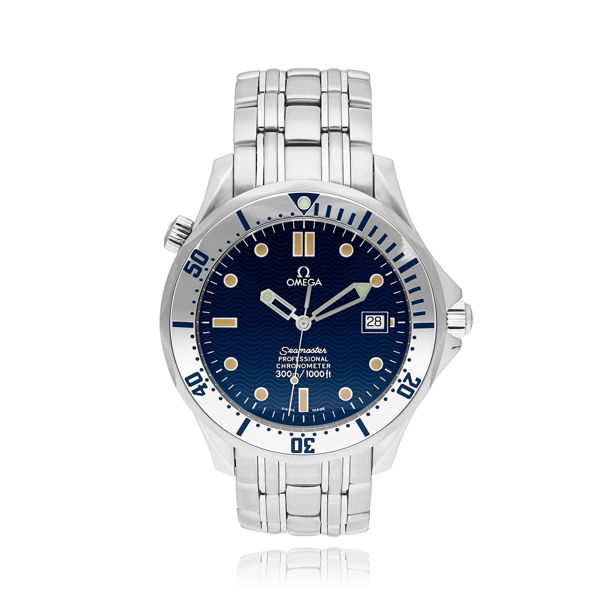 Omega Seamaster with a 44 mm stainless steel case and a sapphire glass, water resistant; inside is the automatic calibre 1109/1120, a blue index face with date indication, the bracelet is a steel metal bracelet; accessory: bucherer box.