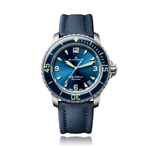 BLANCPAIN wristwatch, Fifty Fathoms 42.3 mm, titanium,. kevlar-bracelet, with folding clasp, blue dial with index, automatic, Cal. 1315, centre seconds, satin finish, sapphire-crystal, 30 atm, Ref.:5010-12B40-O52B