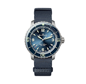 BLANCPAIN wristwatch, Fifty Fathoms 38.2 mm, titanium, with pin buckle, blue dial with index, automatic, Cal. 1315, centre seconds, satin finish, sapphire-crystal, 30 atm, Ref.:5007-12B40-NAOA