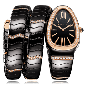 BVLGARI wristwatch, Serpenti Spiga, 35 mm, ceramic, ceramic bracelet, black dial with röm./Index, quartz, sapphire-crystal, 3 atm, diamonds, 18 Karat Roségold mit Diamanten Ref.:103199