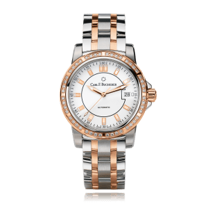 CARL F. BUCHERER Patravi AutoDate 38 mm wristwatch, steel/red gold automatic with date 5 atm/screw-down crown dial: white index, bracelet steel/rose gold, 48 diamonds brilliant cut total 0.75 ct TW-F VVS1 Ref.:00.10617.07.23.31