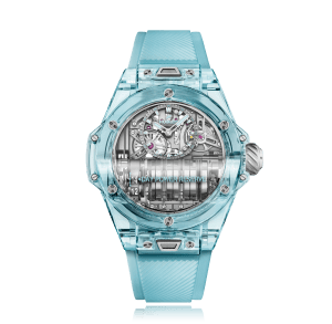 HUBLOT wristwatch, Big Bang MP, 45 mm, sapphire, rubber strap, with folding clasp, skeleton dial with index, manual winding, Cal. HUB9011, sapphire-crystal, 3 atm, with Power-reserve,. 14 Tage, Limited Edition 50 Stk. Ref.:911.JL.0129.RX