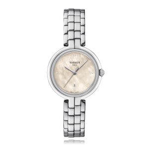 TISSOT wristwatch, Flamingo 30 mm, steel,. steel bracelet, with folding clasp, white mother of pearl dial with 4 diamonds, quartz, Cal. F03.111, centre seconds, sapphire-crystal, 5 atm, Ref.:T094.210.11.116.02