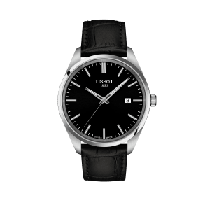 TISSOT wristwatch, Pr 100 40 mm, steel,. leather strap, with pin buckle, black dial with index, quartz, Cal. F06.115, centre seconds, sapphire-crystal, 10 atm, Ref.:T150.410.16.051.00