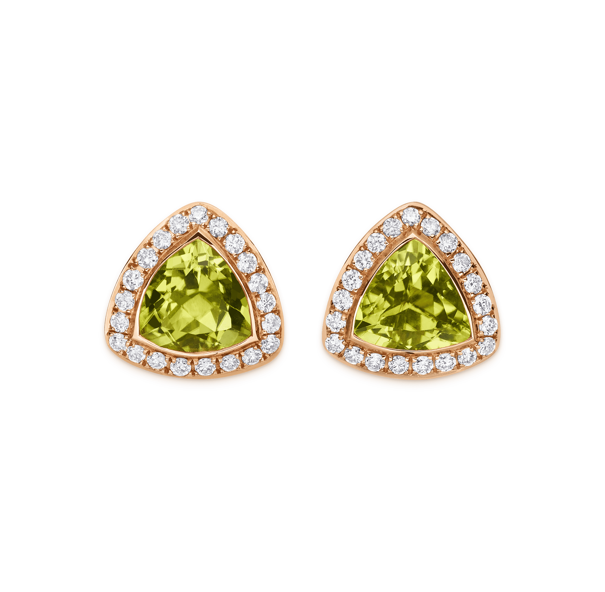 Boucles d'oreilles Shapes entourage or rose 18 ct, 2 péridots (N) taille tricorne total 1.5 ct., 42 diamants taille brillant total 0.21 ct. H- vs