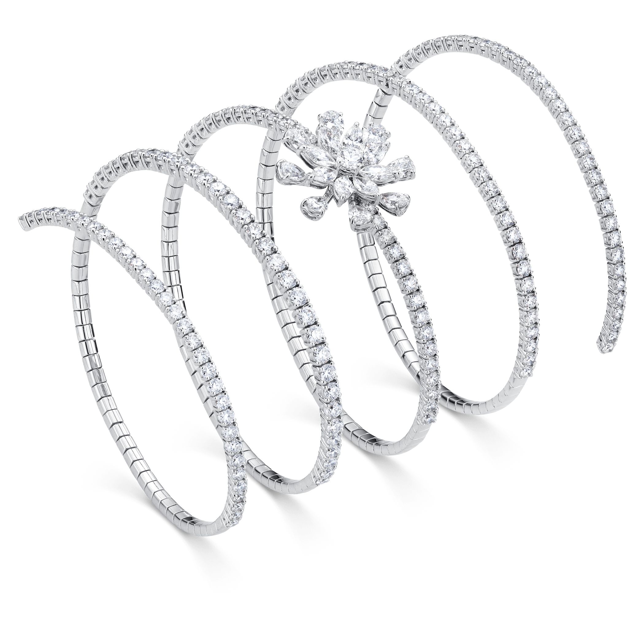 Une finesse que vous pouvez voir et ressentir : ce bracelet en or blanc 18 carats habille votre poignet de manière sophistiquée. La spirale ornée de 153 diamants taille brillant (10,28 carats au total) et de 8 diamants taille marquise (1,53 carat au total) brille élégamment et de manière irrésistible au bras de celle qui porte ce bijou. La pièce maîtresse, cependant, est une somptueuse fleur en diamants qui affiche une élégance unique et fait de ce bracelet un objet de désir. La spirale apparaît déjà comme un symbole dans les premiers témoignages de civilisations humaines. Elle représente l’éternité, ce qui fait de ce bracelet exclusif un bijou ’intemporel.