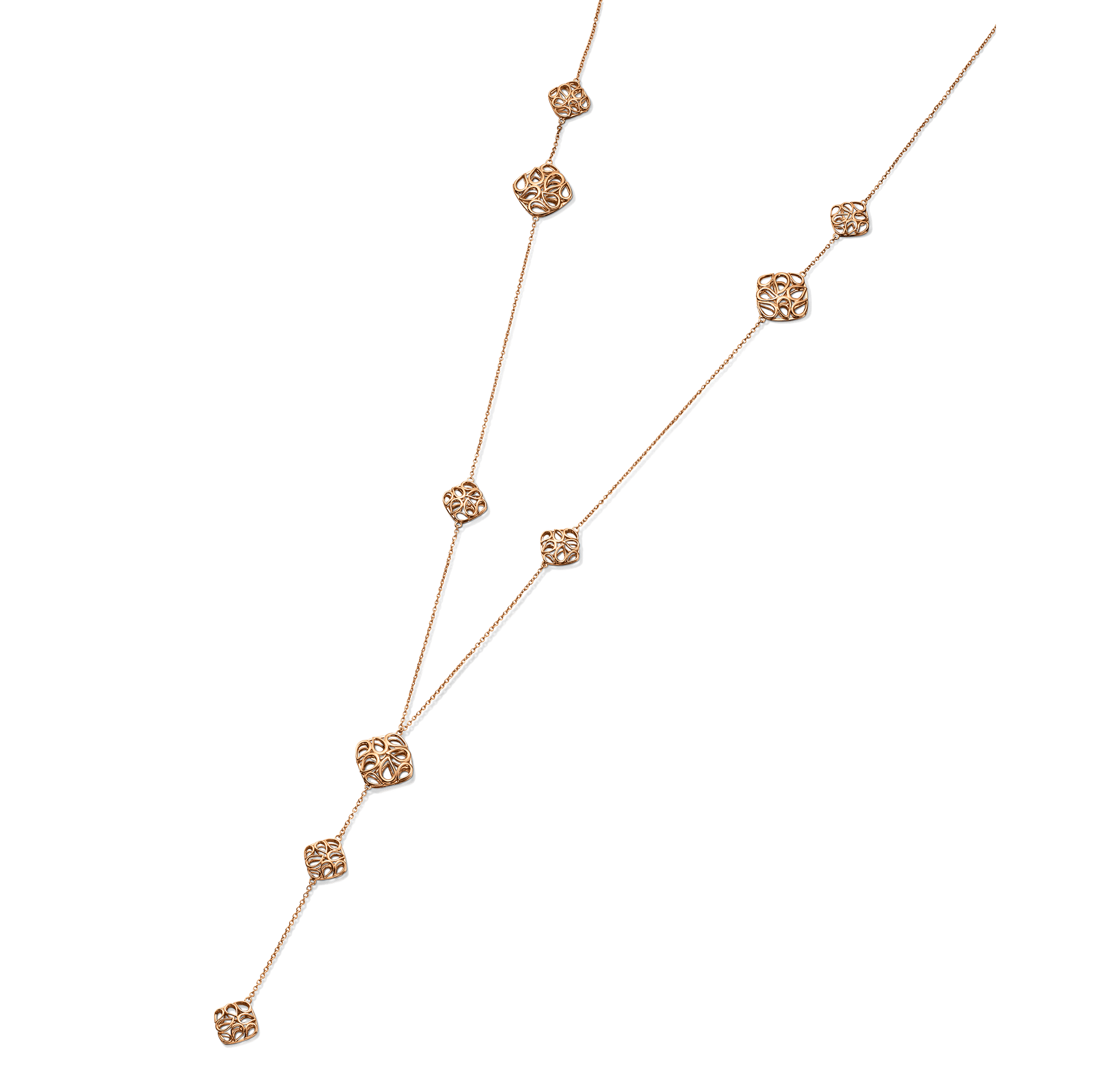 Nombre d’éléments marquants de tailles variées ornent cette chaîne sautoir en or rose 18 carats au doux scintillement, de 90 cm de longueur. Ils sont composés de nombreuses formes de goutte de différentes tailles, cette forme étant typique de la collection. Donnant l’impression de délicates petites grilles, peut-étre un quelconque réve s’y méle-t-il? Ce collier affiche de toute façon une beauté idyllique.