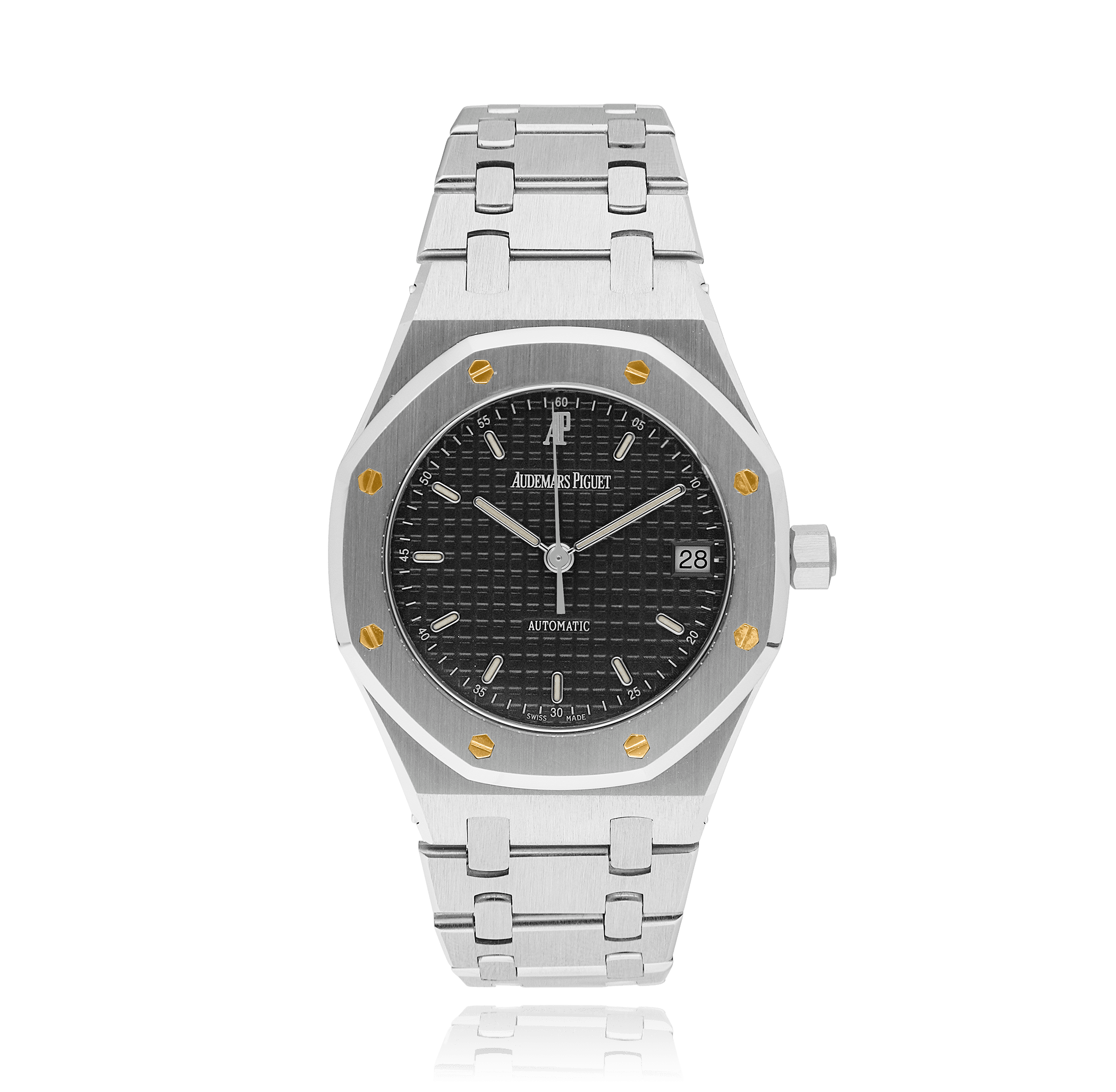 Audemars Piguet Royal Oak avec un boîtier de 36 mm en acier et un verre saphir, étanche; à l'intérieur se trouve le calibre automatique 2225, cadran noir index, indication: avec date, bracelet acier métal; accessoire: écrin de bucherer.