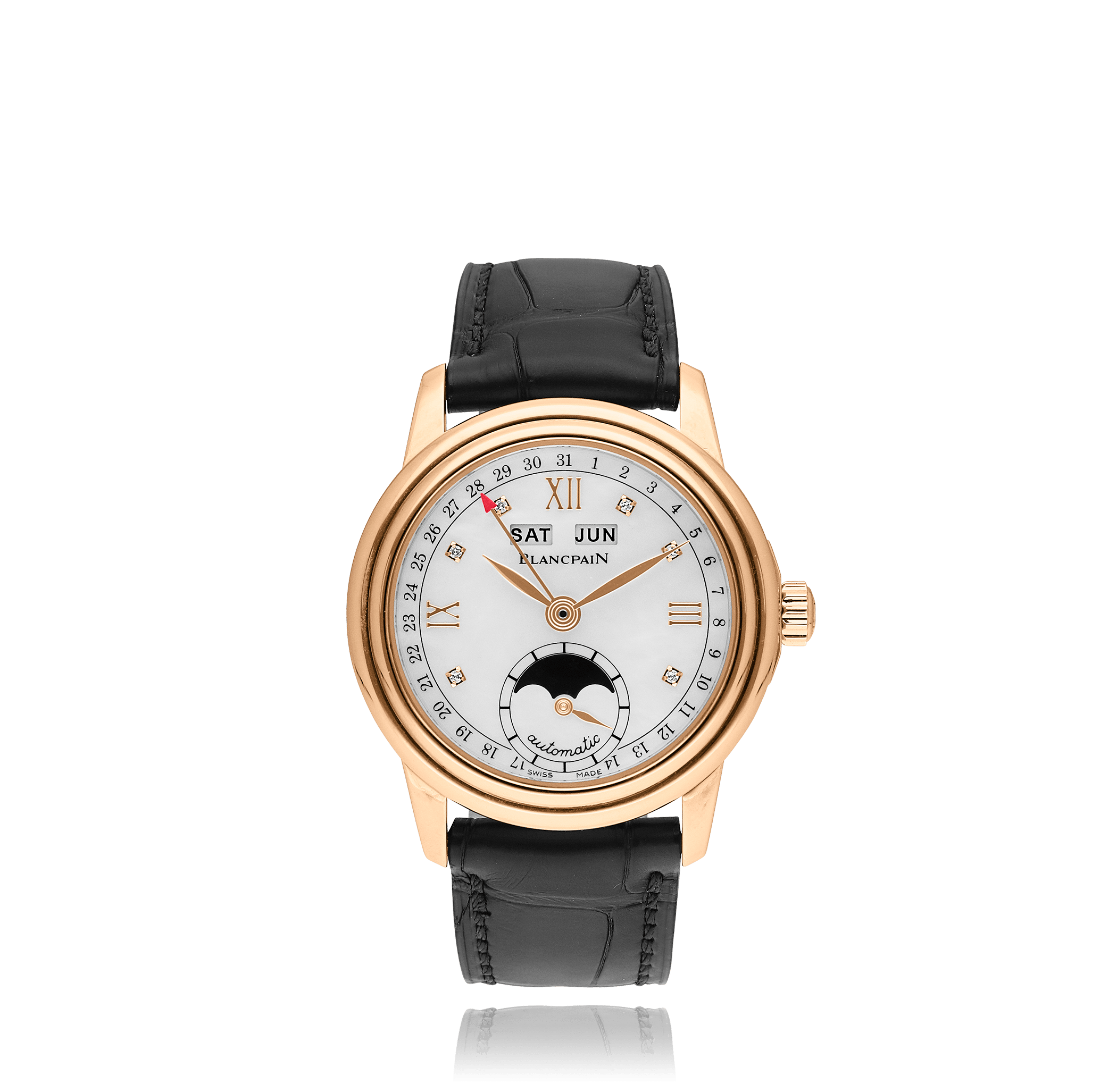 Blancpain Léman avec un boîtier de 33 mm en or rose et un verre saphir, étanche; à l'intérieur se trouve le calibre automatique , cadran nacre romain / diamants, indication: date/jour/mois, bracelet alligator en cuir; accessoire: écrin (original).