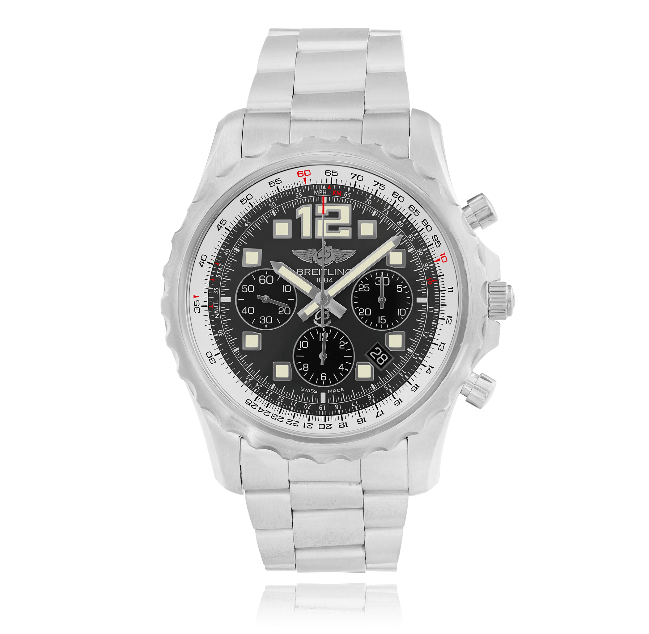Breitling Chronospace avec un boîtier de 48 mm en acier et un verre saphir, étanche; à l'intérieur se trouve le calibre automatique , avec fonction supplémentaire chronographe cadran gris index, indication: avec date, bracelet acier métal; accessoire: écrin de bucherer.