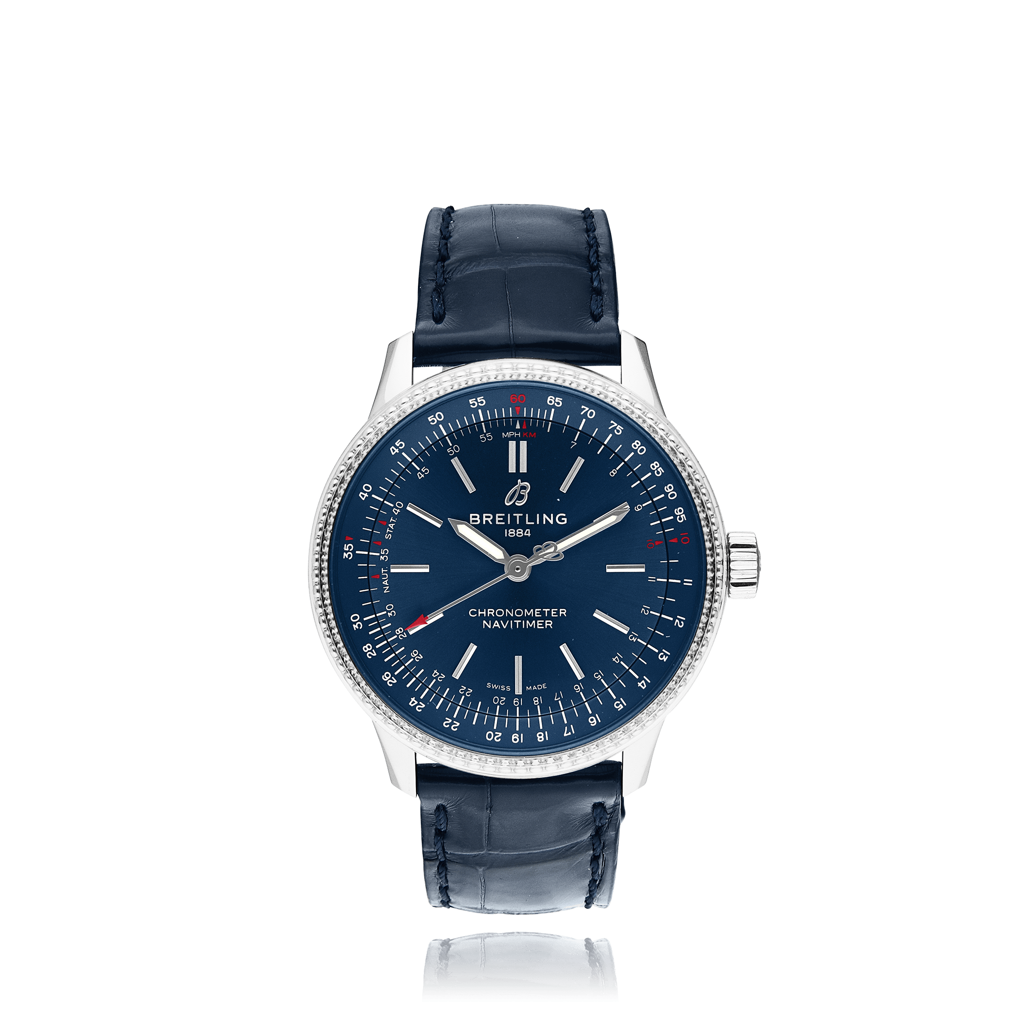 Breitling Navitimer avec un boîtier de 35 mm en acier et un verre saphir, étanche; à l'intérieur se trouve le calibre automatique b17, cadran bleu index, indication: sans date, bracelet alligator en cuir; accessoire: garantie de vente (original), écrin (original).